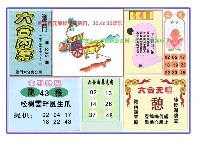 286期:白姐特段/简单发财诗/马会欲钱料/七娘一句中/开藏特图料
